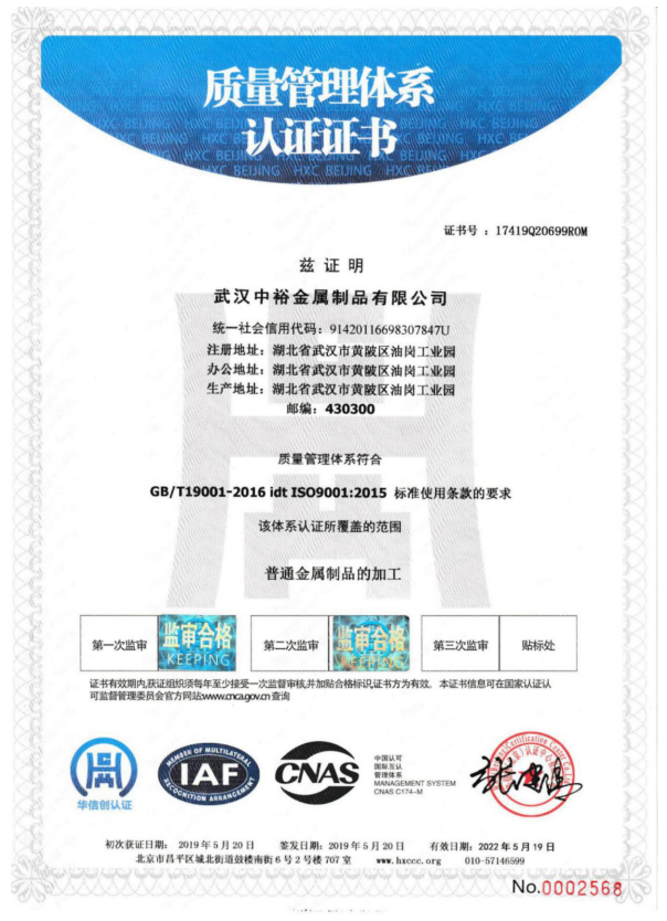 武漢中裕金屬制品有限公司(以下簡稱公司)成立于1996年8月,民營私人獨(dú)資企業(yè)。2010年8月投資1800余萬元,在前川油崗工業(yè)園征地20畝,新建5000平方米的生產(chǎn)車間和1100平方米的辦公大樓,2011年8月全部峻工投入使用。